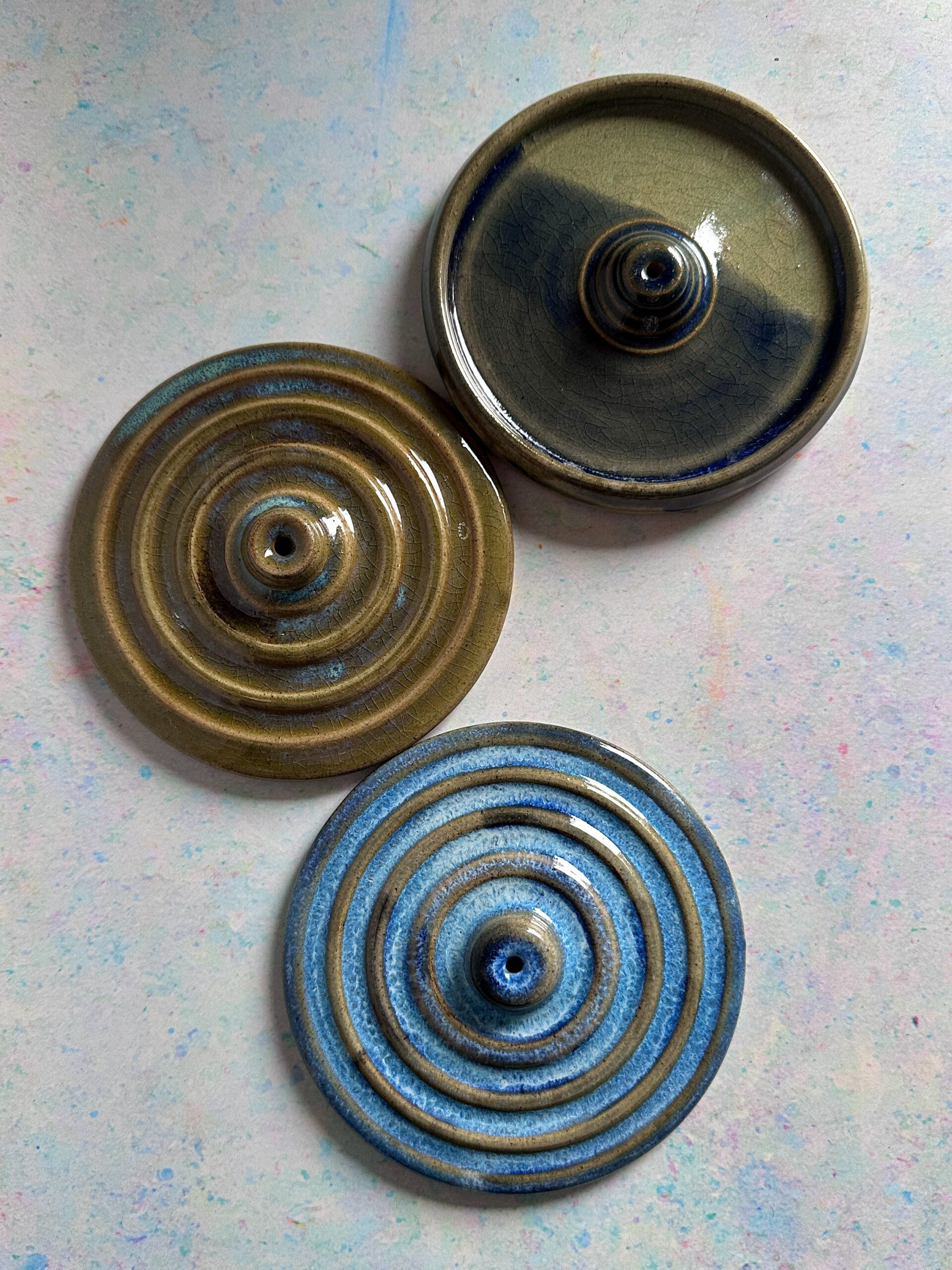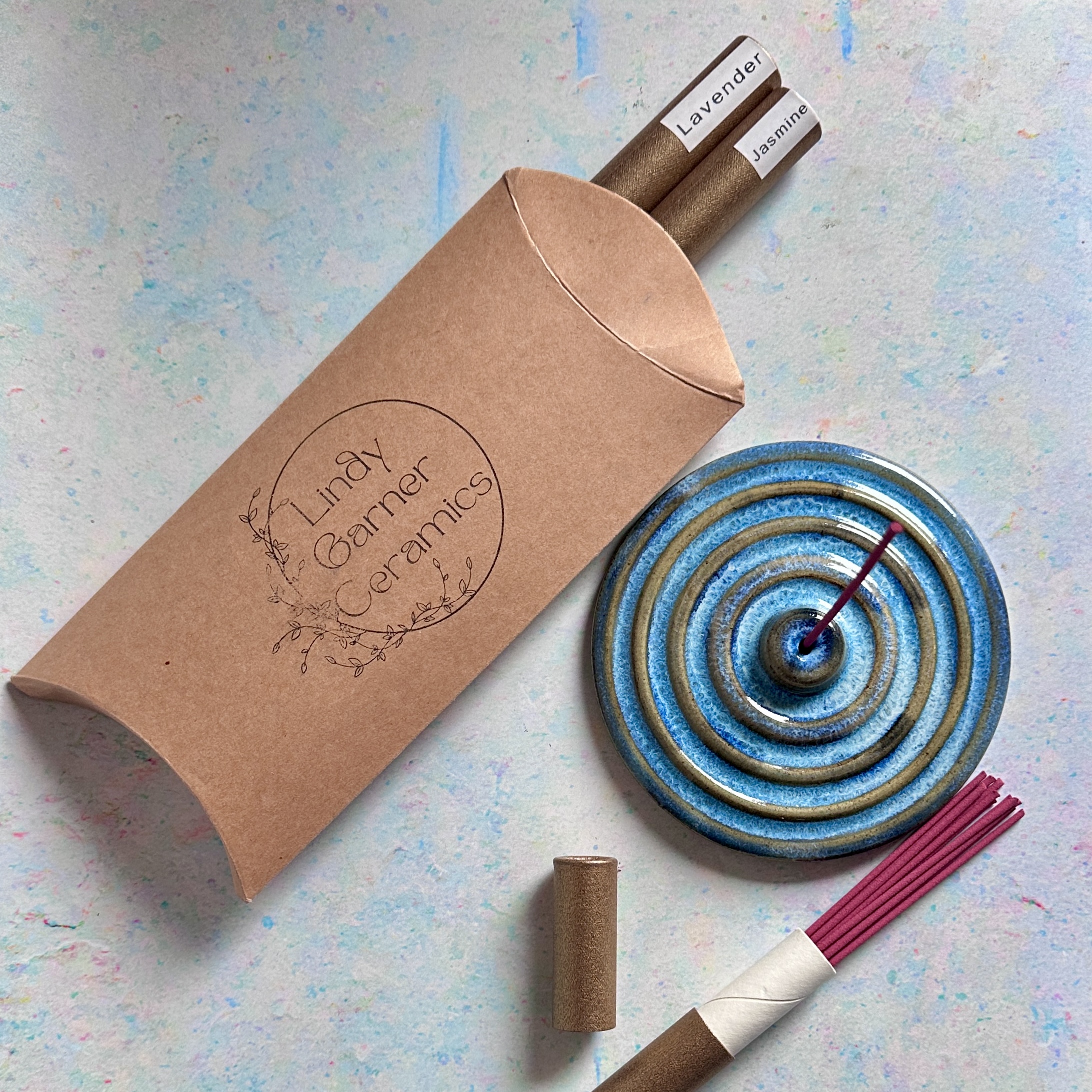 A complete incense set including a handcrafted ceramic holder and three Japanese incense stick scents: Jasmine, Lotus, and Lavender.